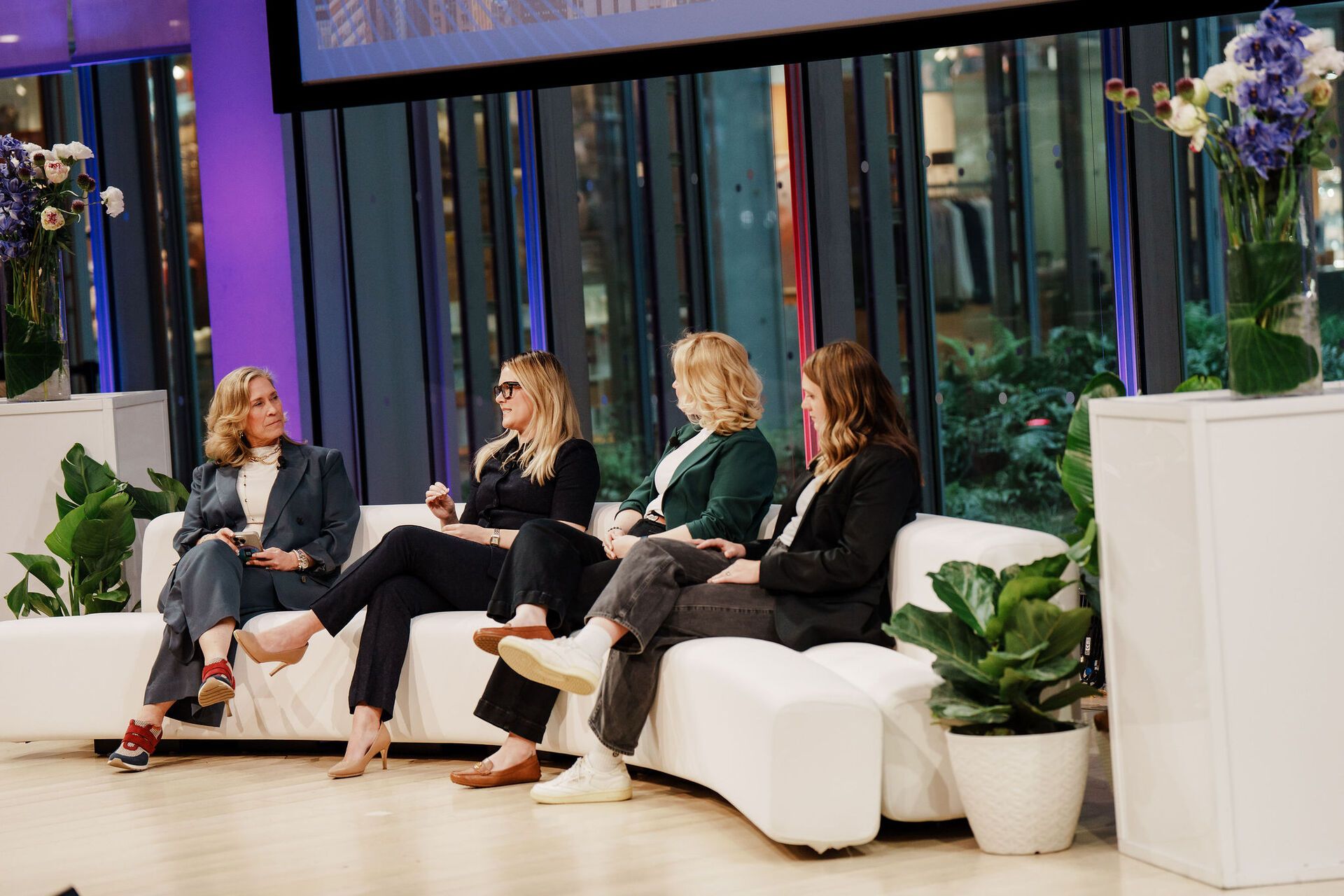Susan Langer, Founder & CEO, Spave (left), leads a panel on enterprise partnerships during the Fintech Is Femme Leadership Summit at the Times Center in New York City. April 23, 2025.